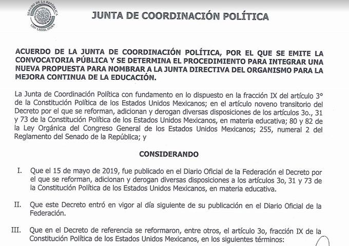 @EducacionFutura : Ahora que el Senado ha decidido reponer el proceso para elegir integrantes del nuevo Organismo Educativo, se ha emitido una nueva convocatoria para buscar a nuevos candidatos, la cual cierra el 23 de junio. Consulta aquí los detalles https://t.co/DnkQdWc9br https://t.co/sPwolCX723 (via Twitter http://twitter.com/EducacionFutura/status/1141506545789919232)
