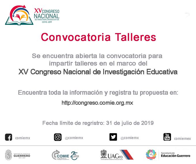 @EducacionFutura : El COMIE invita a participar en la convocatoria para impartir talleres en el marco del XV Congreso Nacional de Investigaci贸n Educativa #XVCNIE #CNIE2019 Consulta la convocatoria y registra tu propuesta en el siguiente enlace: 馃憠 https://t.co/HaN9cupuqK https://t.co/IF35JMiNgu (via Twitter http://twitter.com/EducacionFutura/status/1151131939534856193)