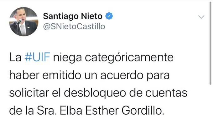 @EducacionFutura : #Actualización - El titular de la Unidad de Inteligencia Financiera, Santiago Nieto, aseguró mediante su cuenta de Twitter que no se ha emitido ningún acuerdo para desbloquear las cuentas de Elba Esther Gordillo https://t.co/PYSMbWU7Kq (via Twitter http://twitter.com/EducacionFutura/status/1195461155587870722)