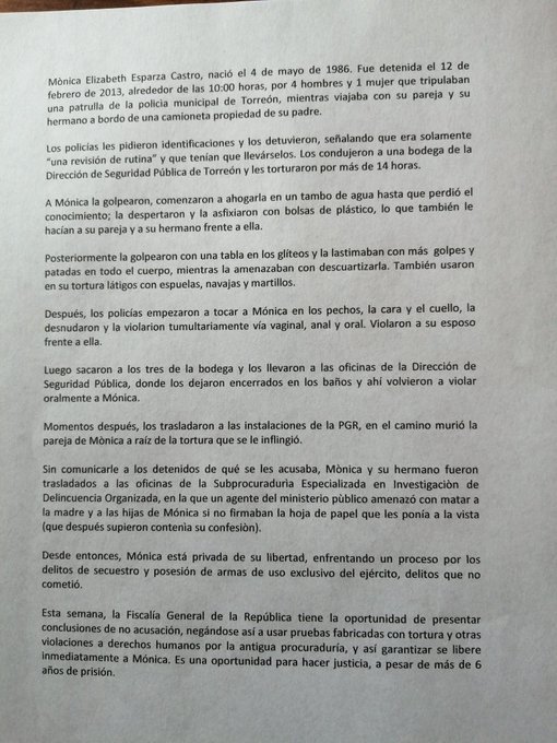 @ManuelGilAnton : Mónica lleva más de 6 años presa por un delito que no cometió. La tortura a ella, su pareja y hermano fue brutal. La describo en el breve documento que anexo. Ayudemos a difundir con muchos RT. Pueden firmar en htpp://chgn.it/ 2K25CyCJ una petición. Urge, esta semana es crucial. https://t.co/EqktfxphrB (via Twitter http://twitter.com/ManuelGilAnton/status/1199710022030127104)