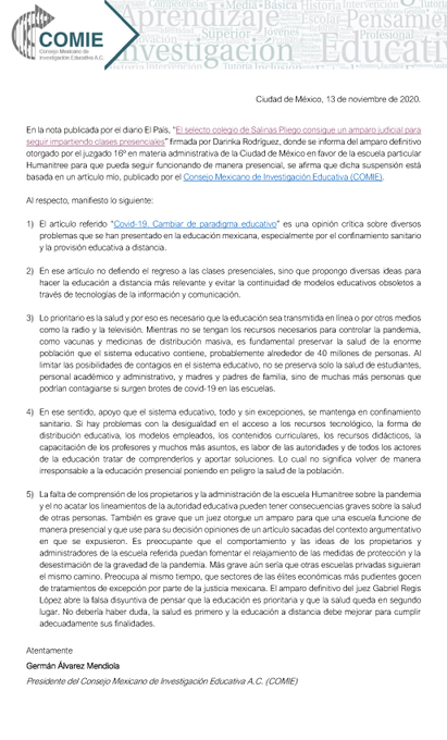 @EducacionFutura : RT @comiemx: Comunicaci贸n importante de @Germnlvarez, presidente del @comiemx, ante nota de @elpaismexico que informa del amparo a la escuela Humanitree para dar clases presenciales. 馃憞 https://t.co/QJh1HlF4rc @el_pais @EducacionFutura @FaroEducativo @ConexionCinves @DIE_CINVESTAV https://t.co/64uJpxoOnE (via Twitter http://twitter.com/EducacionFutura/status/1327378325225021443)